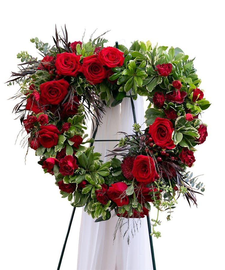 The Classic Red Heart stand is a touching expression of love and remembrance, featuring a heart-shaped design crafted from elegant red roses and greenery. This arrangement symbolizes love, peace, and heartfelt condolences. It offers a serene and meaningful tribute, honoring a loved one with grace and compassion.