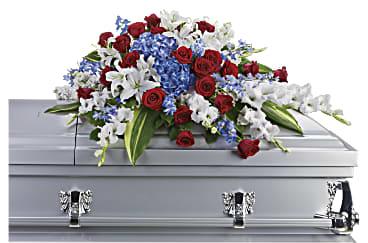 The Distinguished Service casket cover features red roses and blue hydrangeas, creating a beautiful and patriotic tribute. The blend of these vibrant blooms on this casket cover offers a heartfelt expression of service and remembrance, honoring a cherished life with beauty.