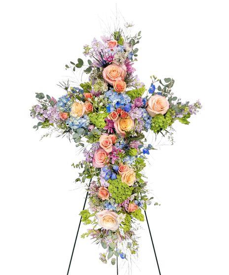 The Garden Walk Cross sympathy stand is a touching expression of love and remembrance, featuring a cross-shaped design crafted from elegant pastel florals and other soft blooms. Accented with delicate greenery, this arrangement symbolizes love, peace, and heartfelt condolences. It offers a serene and meaningful tribute, honoring a loved one with grace and compassion.