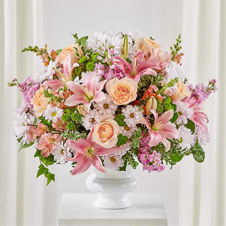 The Heartfelt Gesture Urn Arrangement is a vibrant bouquet of peace and love, featuring a variety of pink hues, including roses, lilies, and more. Accented with greenery, this arrangement offers a serene and elegant expression of love.