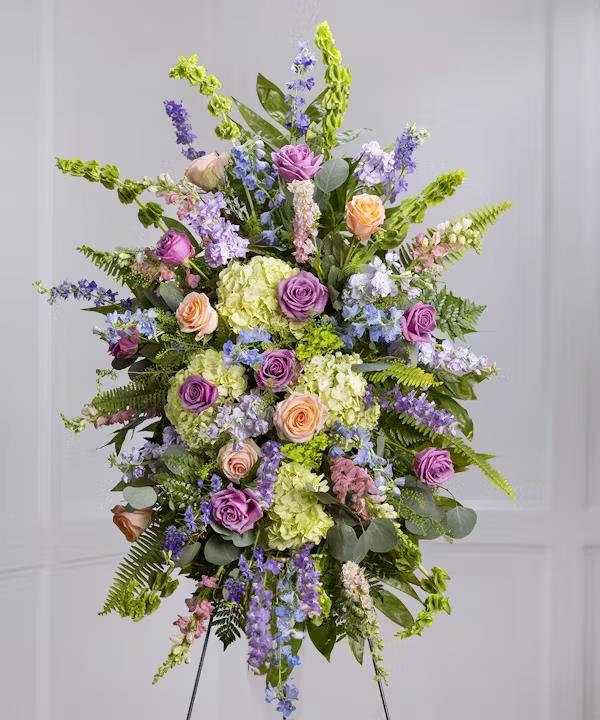 The Pastel Garden standing spray is a graceful tribute, featuring pastel violet blooms arranged in a harmonious display of love and remembrance. Accented by a touch of white hydrangeas, the spray exudes a sense of serenity and beauty, offering comfort in difficult times. This stunning floral arrangement is a heartfelt expression of compassion, designed to honor and celebrate a cherished life.
