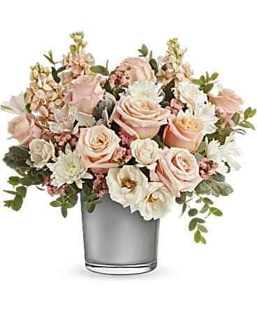 The Teleflora’s Radiant Blossoms Bouquet is a soft, pink-hued arrangement that captures a variety of blooms, featuring stems of roses, daisies, and more. The Teleflora’s Radiant Blossoms Bouquet is the perfect arrangement to say “congratulations,” “I Love You,” or “just because.”